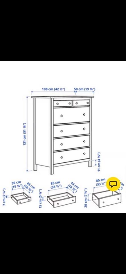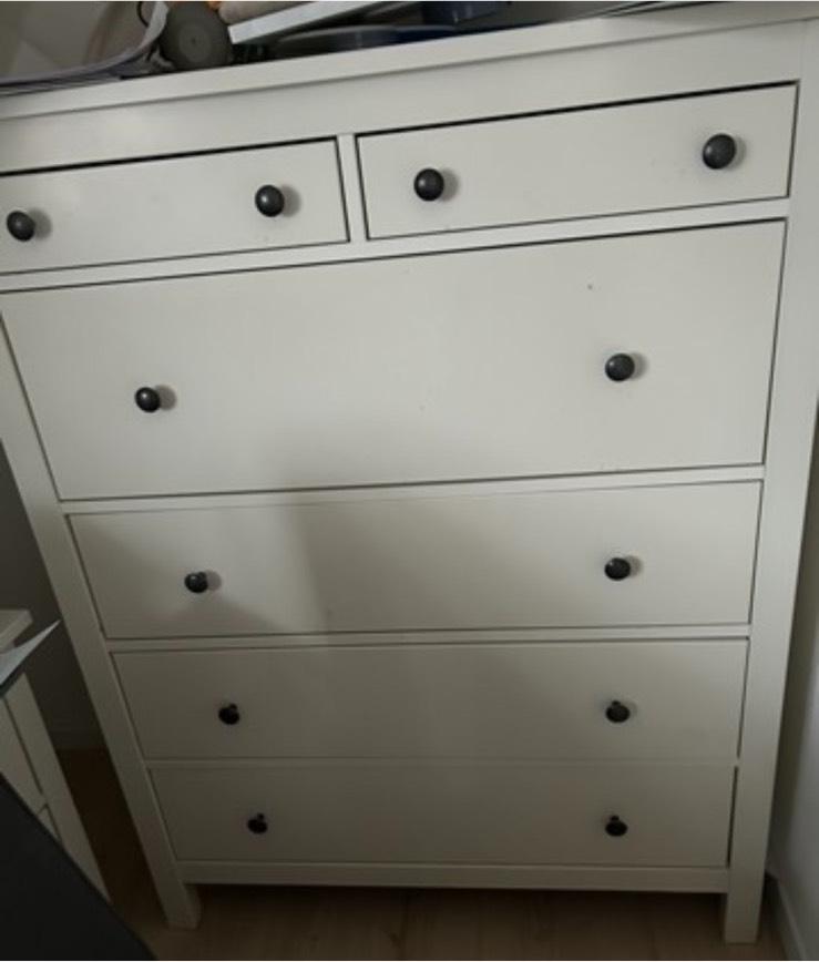 Wir verschenken unsere Hemnes Kommode, da wir Platz für unseren Nachwuchs schaffen müssenDie Kommode bietet viel Stauraum mit mehreren geräumigen Schubladen (2 kleine oben, 3 große darunter). Ideal fürs Schlafzimmer, Kinderzimmer oder den Flur.Zustand:Deutliche Gebrauchsspuren vorhanden (siehe Fotos). Technisch aber voll funktionsfähig – alle Schubladen lassen sich gut öffnen und schließen.Maße:ca. 108 cm breit, 131 cm hoch, 50 cm tief.Nur Abholung. Kein Versand.Da es sich um eine Schenkung handelt, keine Garantie oder Rücknahme.Bei Interesse einfach melden