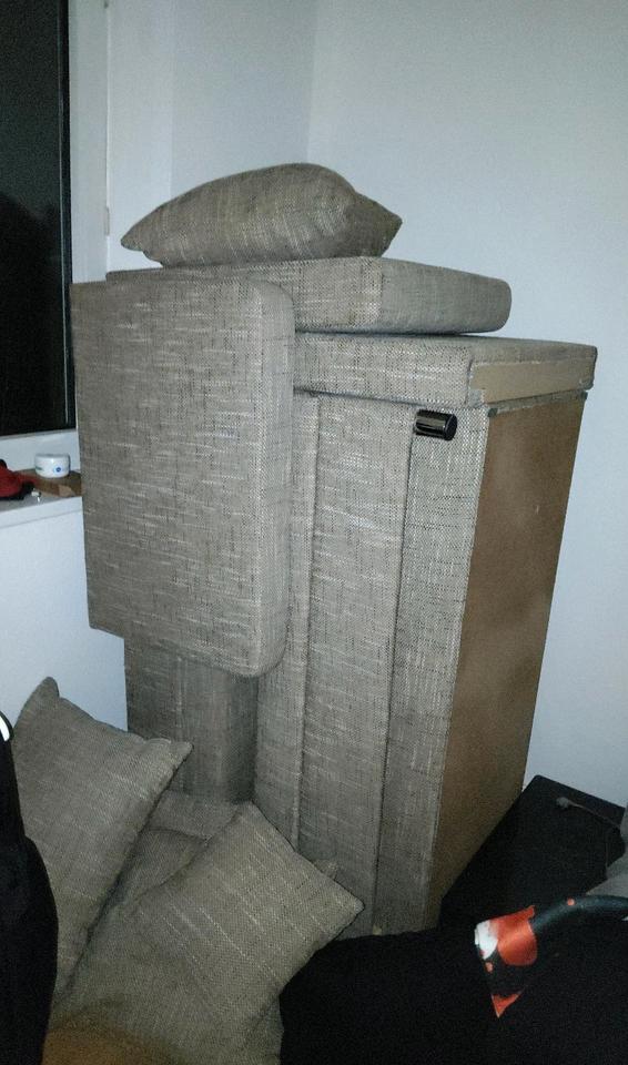 Eckcouch (auf dem Bild auseinander gebaut - muss nur zusammen gesteckt werden), zu verschenken. Zustand gut.Nur Abholer.