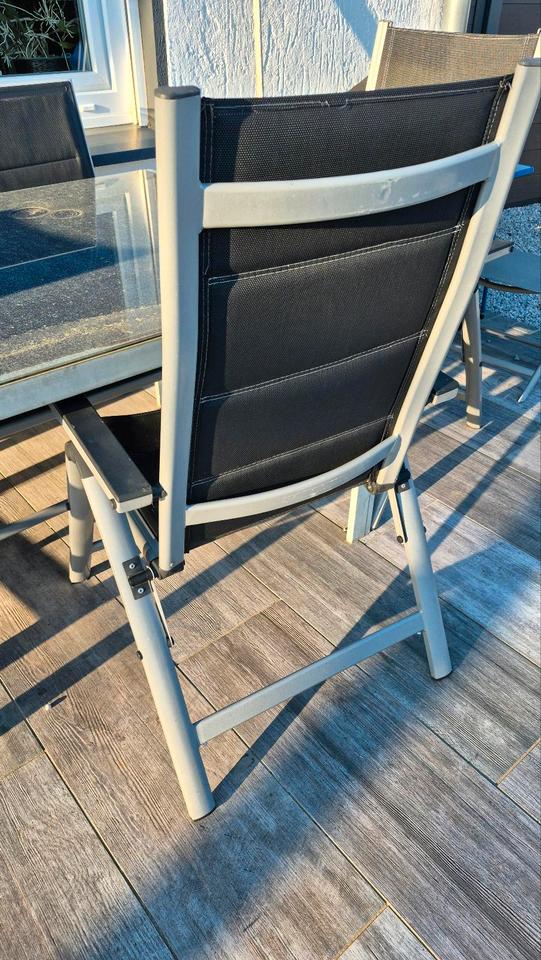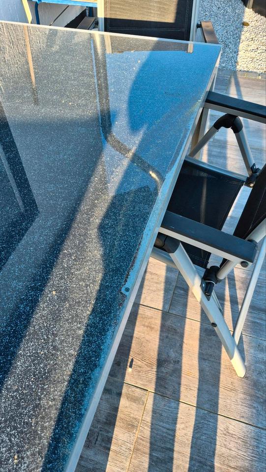 Zu verschenken.1 Gartentisch 150cm lang mit Glasplatte und 3 Hochlehner Stühle. Alles etwas kaputt. Siehe Bilder. Alle Stühle sind an den Armlehnen kaputt.