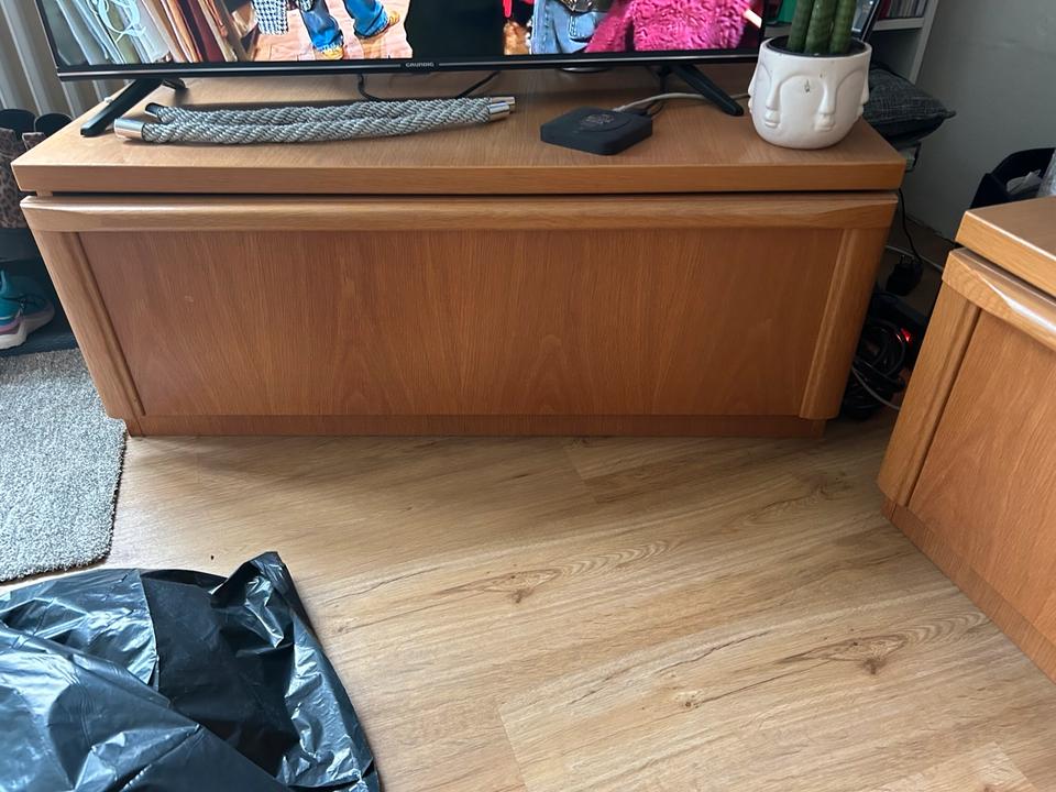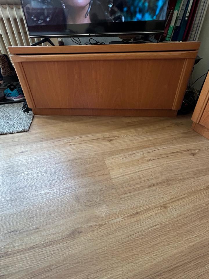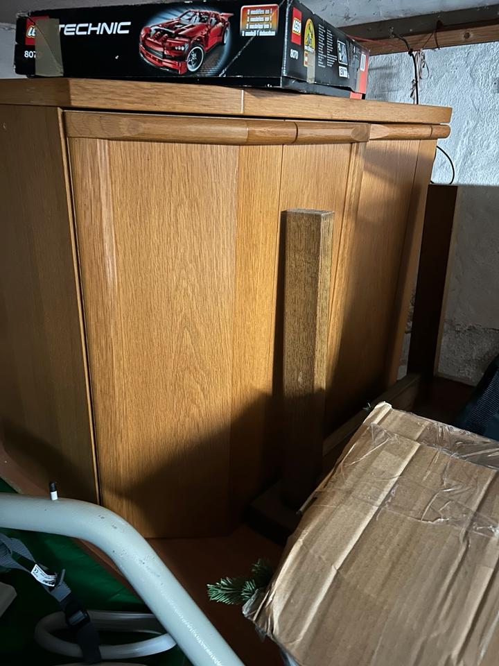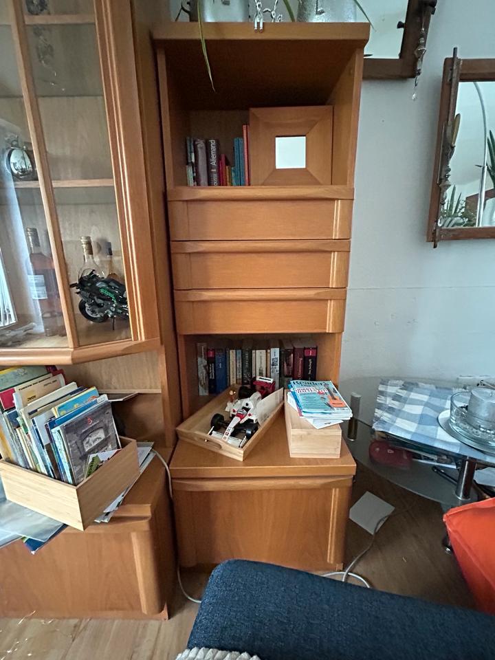 Wohnzimmerschrank MassivholzZusammen oder getrennt stellbarAn Selbstabholer und -abbauerVitrinenschrank insgesamt 2.20m hoch, 1m breit , 2 Türen und 1 große SchubladeSchmaler Schrank 0.50m breit, 1.45m hoch, 3 kleine und eine große SchubladeLowboard kann durch den 2-türigen Aufsatz ergänzt werden, 1m breit, 0.42m hochAufsatz 1m breit, 0.75m hochOhne Deko
