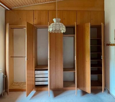 Kleiderschrank mit allen Böden, Kleiderstangen und Regalen (inkl. weiße Ausziehregale) wie auf den Fotos zu sehenEchtholzfurnierMaße:Breite: 340cmHöhe 225cm (Hauptschrank) + 50cm (Aufsatz), trennbarBereits komplett abgebaut und zur Abholung bereitPrivatverkauf