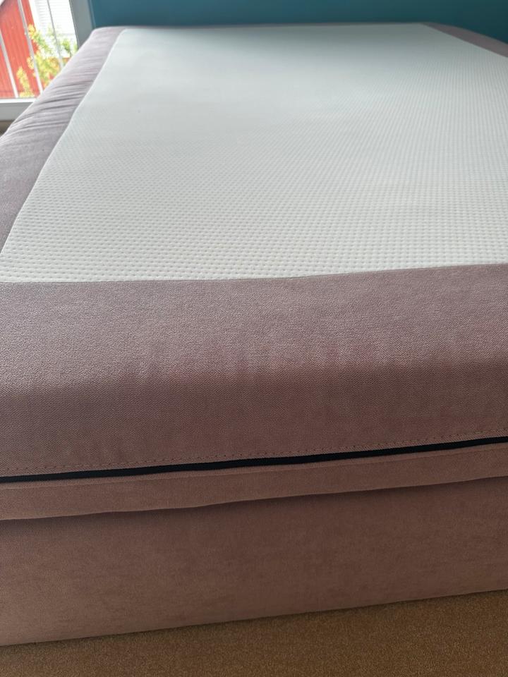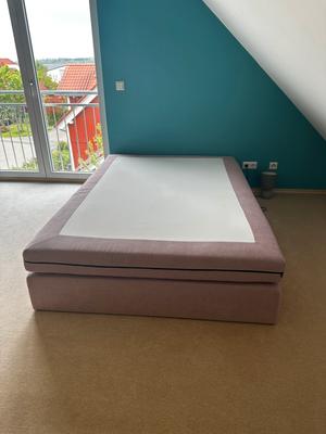 Zu verschenken:gut erhaltenes Bett in Altrosa, das nur selten als Gästebett genutzt wurde. Es wird ohne Kopfteil abgegeben. Die Matratze verfügt über einen Reißverschluss und der Bezug kann daher gewaschen werden.