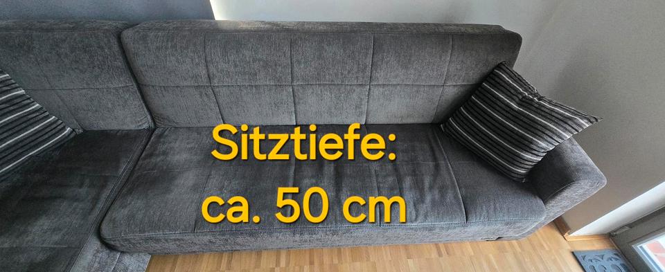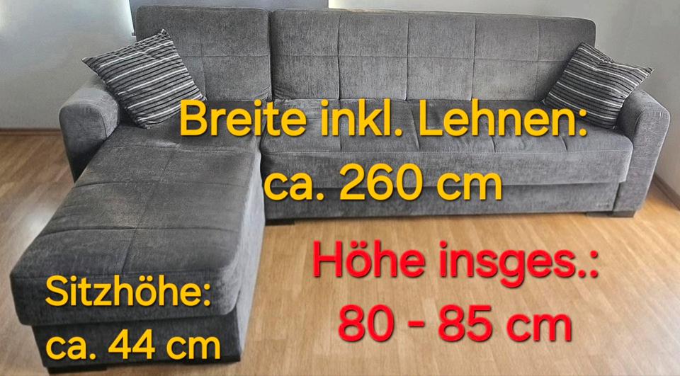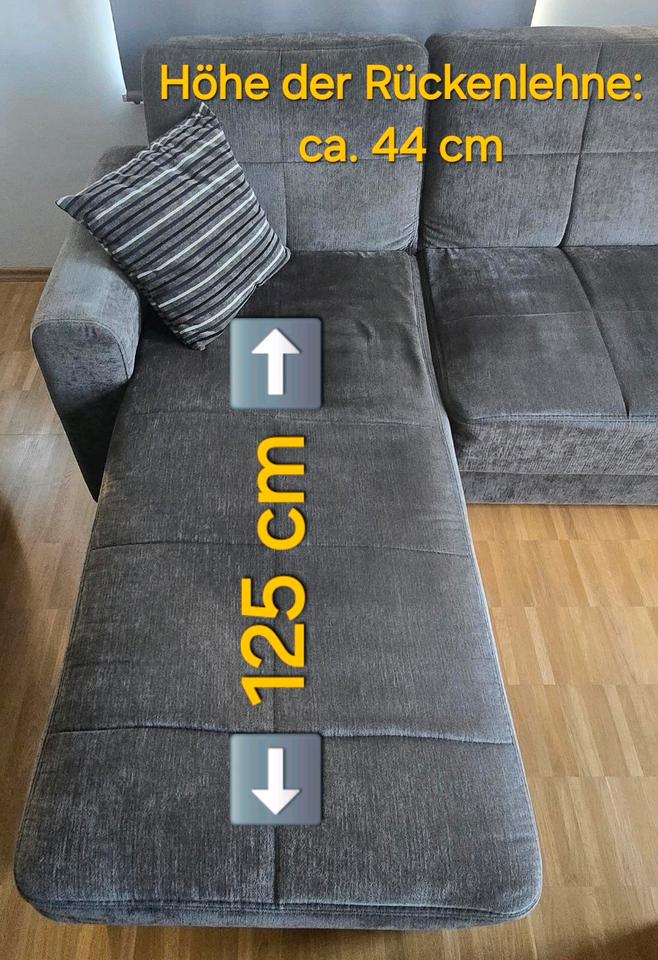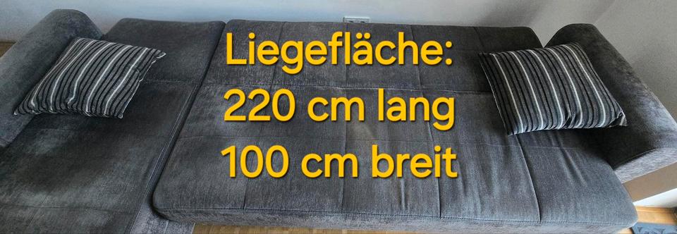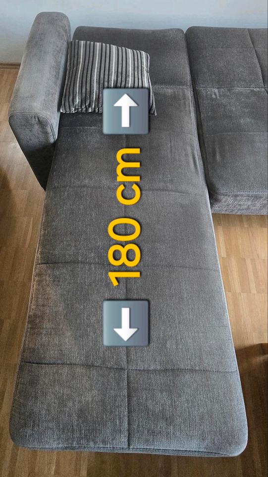 Ein gebrauchtes Ecksofa mit Schlaffunktion und Stauraum aus dunkelgrauem Soffbezug abzugeben!Das L kann sowohl links als auch rechts angebracht werden... Die Maße befinden sich auf den Bildern!Aufgrund des täglichen Gebrauchs haben sich bereits Sitzkuhlen gebildet, es machen sich inzwischen auch einige Federn bemerkbar und an jeweils einer der Lehnenkanten gibt es keine Polsterung mehr (s. Foto).Ansonsten ist es aber noch voll funktionstüchtig und sauber! ✌